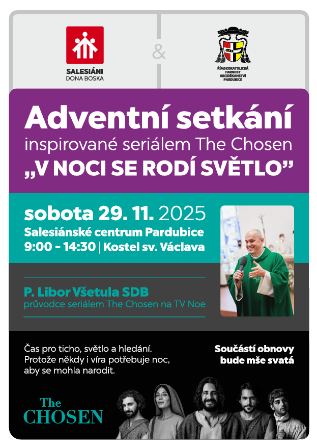 Duchovní obnova před adventní dobou bude v sobotu 29. listopadu od 9:00 u Salesiánů. Obnova bude zahájena mší svatou v kostele sv. Václava. Těšit se můžete na přednášky salesiánského kněze P. Libora Všetuly, který je známým průvodcem seriálu The Chosen.