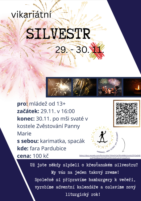V sobotu 29. listopadu od 16:00 proběhne v horním sále fary KŘESŤANSKÝ SILVESTR s možností přespání na faře. Kdo bude chtít, zakončíme to nedělní dětskou mší v Klášterním kostele. Zvána je veškerá mládež 13+ z Pardubic.