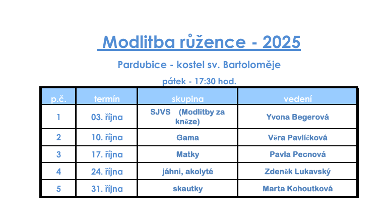 Zveme do kostela sv. Bartoloměje ke společné modlitbě růžence každý pátek před večerní bohoslužbou v 17:30. Modlitbu vždy povede jiné farní společenství.