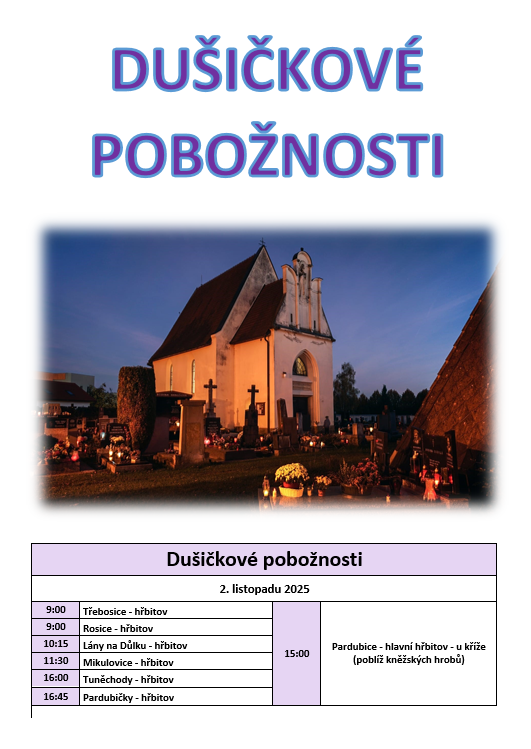Na Svátek Všech Svatých 1. listopadu budou slouženy mše svaté v 6:30 a v 18:00 v kostele sv. Jana Křtitele a v 9:00 v kostele sv. Bartoloměje. V neděli 2. listopadu, v den kdy vzpomínáme na všechny věrné zemřelé vás zveme k pobožnostem na hřbitovech.