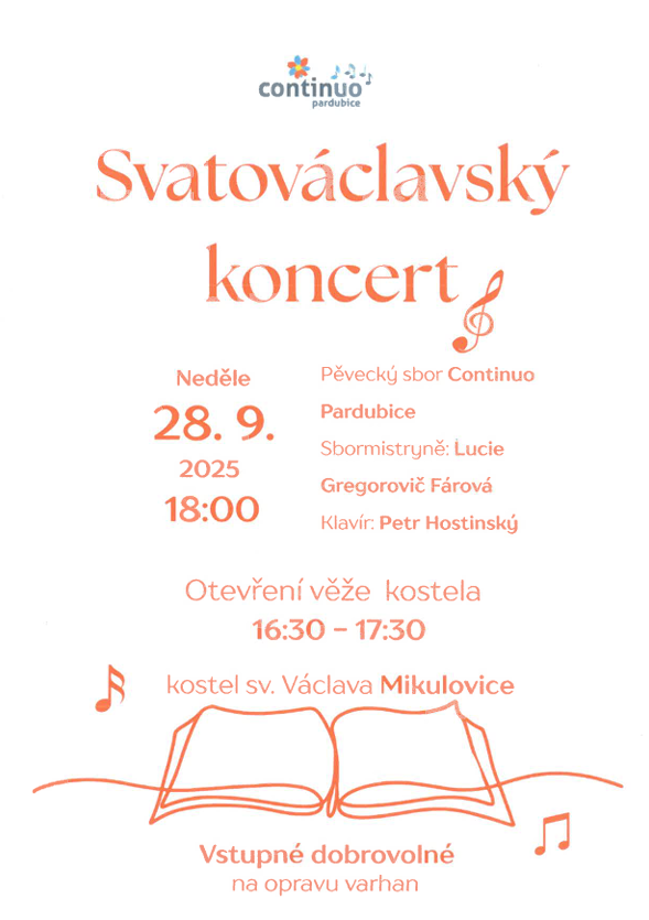 V neděli 28. září v 18:00 jste zváni na Svatováclavský koncert pěveckého sboru Continuo do kostela sv. Václava v Mikulovicích. Vstupné je dobrovolné a bude použito na opravu varhan.