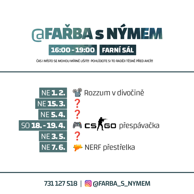 Zvu všechny mladé na různorodé setkávání na faře. Akce budou otevřené a nezávazné a budou se postupně ladit podle toho, kolik nás bude a na co bude hlavně chuť.