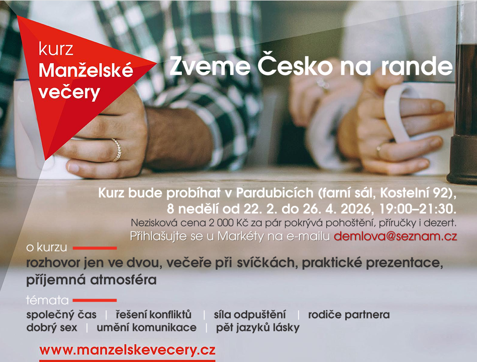 Zveme Vás na Manželské večery, osmidílný kurz pro páry (sňatek není podmínkou), které jsou spolu alespoň několik let (kurz není určen novomanželům ani snoubencům). Tento kurz, který pochází ze stejné „tvůrčí dílny“ jako kurzy Alfa, se v naší farnosti bude konat od 22. února do 26. dubna.