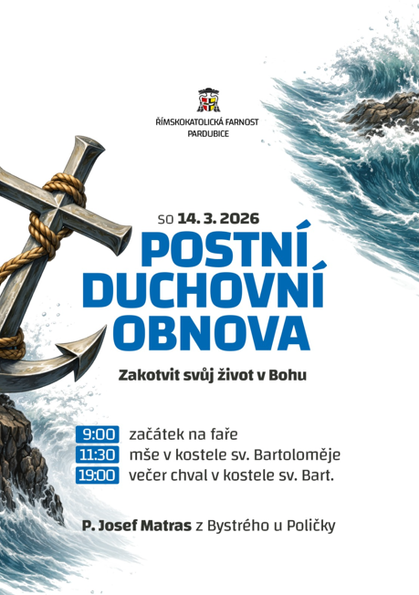 V sobotu 14. března od 9:00 v prostorách fary v Pardubicích se bude konat postní duchovní obnova. Pozvání přijal P. Josef Matras z Bystré u Poličky. Téma je "Zakotvit svůj život v Bohu".