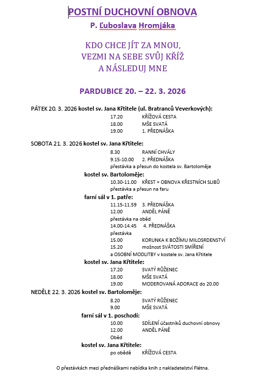P. Ľuboslav Hromják vás zve o víkendu 20. – 22. března na duchovní obnovu, která je připravena na téma „Kdo chce jít za mnou, nechť zapře sám sebe, vezme svůj kříž a následuje mě“. Duchovní obnova je určena především pro přátele P. Ľuboslava, kteří přijedou ze Slovenska a to ze Spiše. Pokud máte zájem, tak budete na duchovní obnově srdečně od otce vítáni.