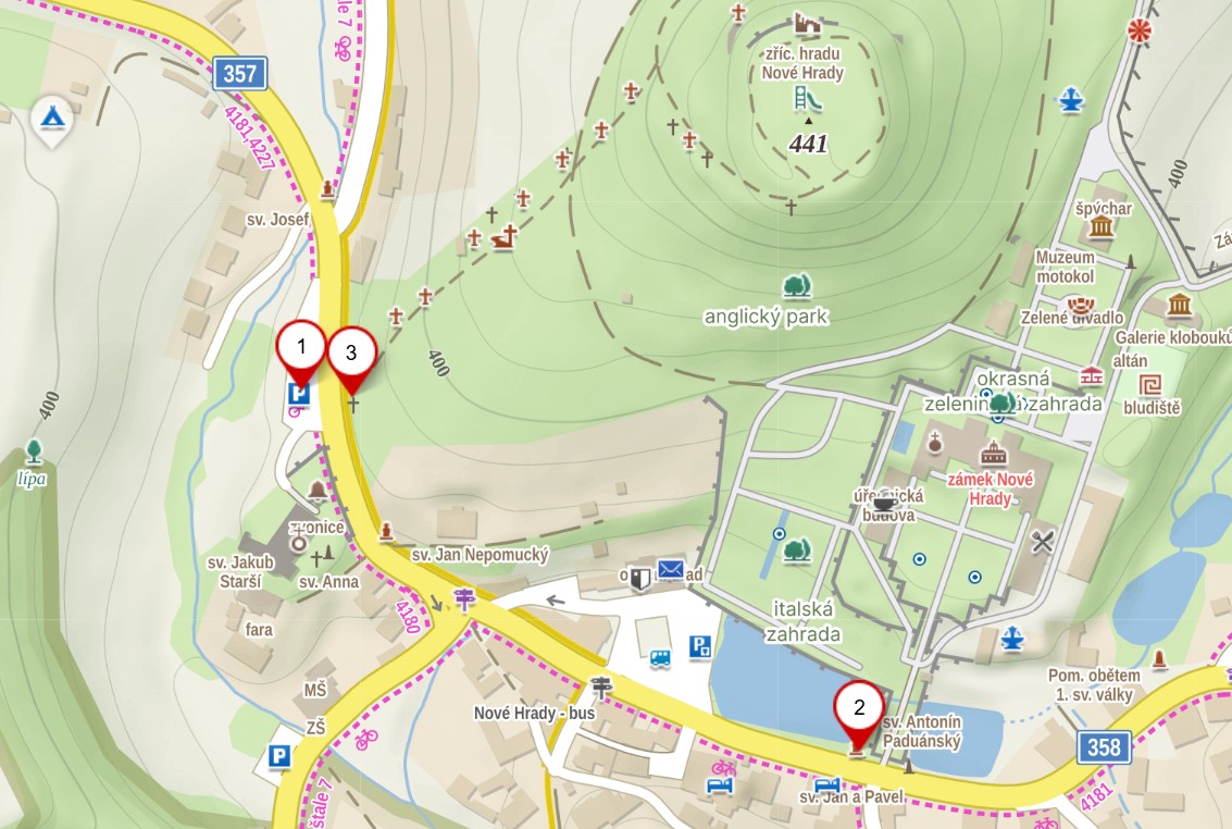 Také v letošním roce vás zveme na Velký pátek (3. 4. 2026) na „poutní“ křížovou cestu, a to do Nových Hradů. Barokní křížová cesta vede sice od kostela sv. Jakuba Staršího (GPS: 49.8530933N, 16.1416069E– mapa: bod 3), ale přístup k ní je možný pouze přes zámecké zahrady. Přístup do zámeckých zahrad je omezený otevírací dobou (na Velký Pátek je ale zámek otevřen) a navíc je přístup zpoplatněn. Paní majitelka zámku nám ale vyšla vstříc a předběžně nám slíbila (s dodržením určitých podmínek) přistup ke křížové cestě bez poplatku.
